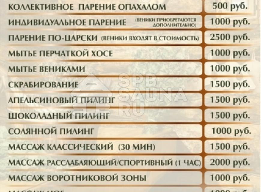 Услуги: веники, банщик, спа-терапия, оздоровительный массаж, ароматерапия, кальян