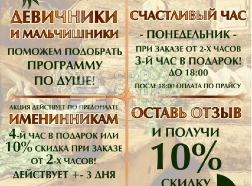 - День Рождения - 4й час подарок или 10% скидка от 3х часов, действует +-3 дня;