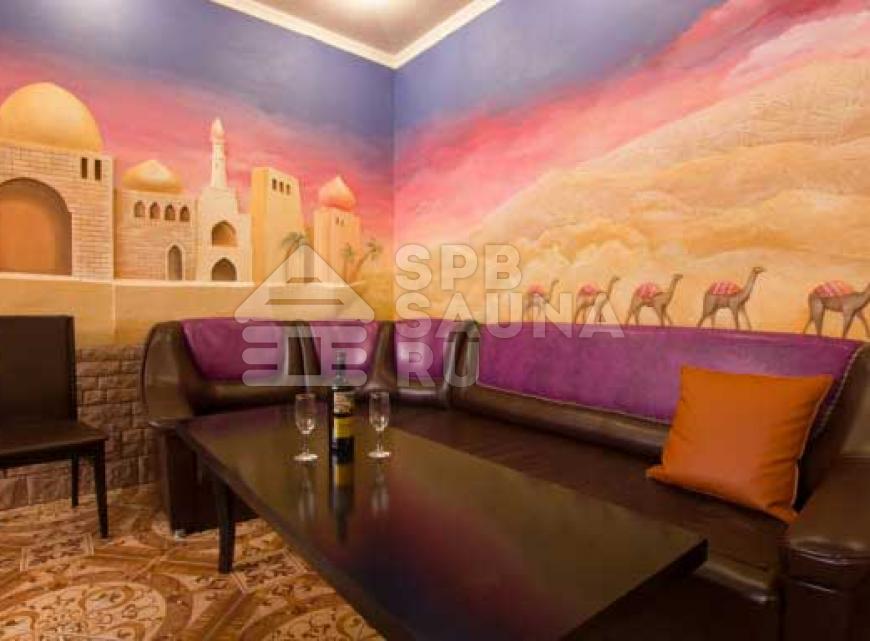 Восточный стиль интерьера сауны выполнен в единой композиции, причудливая роспись на стенах, роскошная мебель, мягкое освещение и квалифицированный персонал - будут способствовать банно-оздоровительному отдыху как души, так и тела.