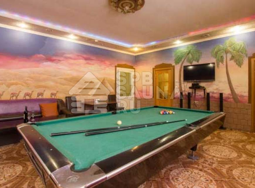 - Гостиный зал с двумя столами для трапезы и кожаным угловым диваном. Продукты для банкета вы можете принести с собой, или же заказать у нас доставку блюд. В гостином зале также - бильярд, спутниковое и смарт ТВ, система DVD караоке, Wi-Fi. Дополнительно можем приготовить кальян.